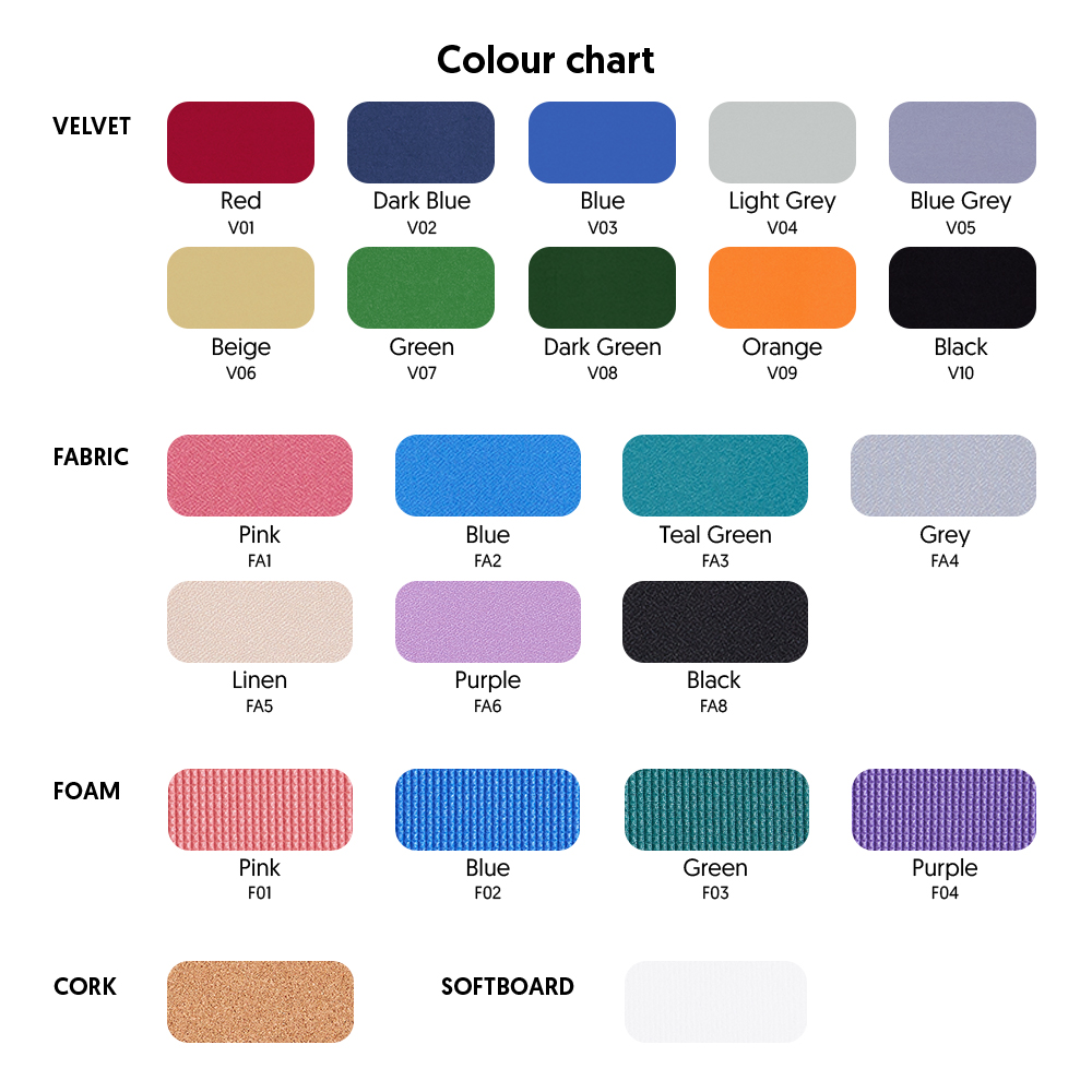 - Velvet, Fabric, Foam, Cork, and Soft Board